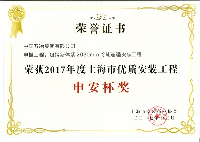 包鋼新體系2030mm冷軋連退安裝工程-2017年度上海市優(yōu)質(zhì)安裝工程申安杯獎(jiǎng)