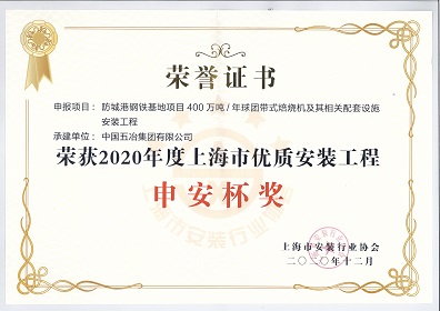 防城港鋼鐵基地項目400萬噸/年球團帶式焙燒機及其相關配套設施安裝工程-2020年度上海市優質安裝工程申安杯獎