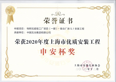 特斯拉超級工廠項目(一期)聯合廠房5.1安裝工程-2020年度上海市優質安裝工程申安杯獎