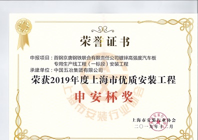 首鋼京唐鋼鐵聯合有限責任公司鍍鋅高強度汽車板專用生產線工程(一標段)安裝工程-2019年度上海市優質安裝工程申安杯獎