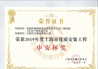 首鋼京唐鋼鐵聯合有限責任公司二期球團2#生產線安裝工程-2019年度上海市優質安裝工程申安杯獎