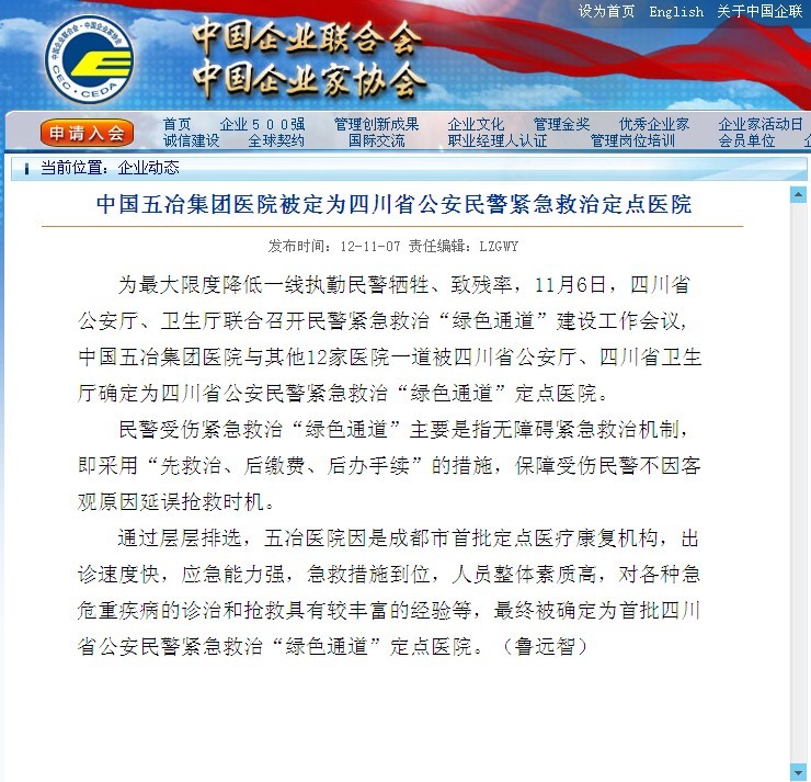 中國企業聯合會報道:中國五冶集團醫院被定為四川省公安民警緊急救治定點醫院