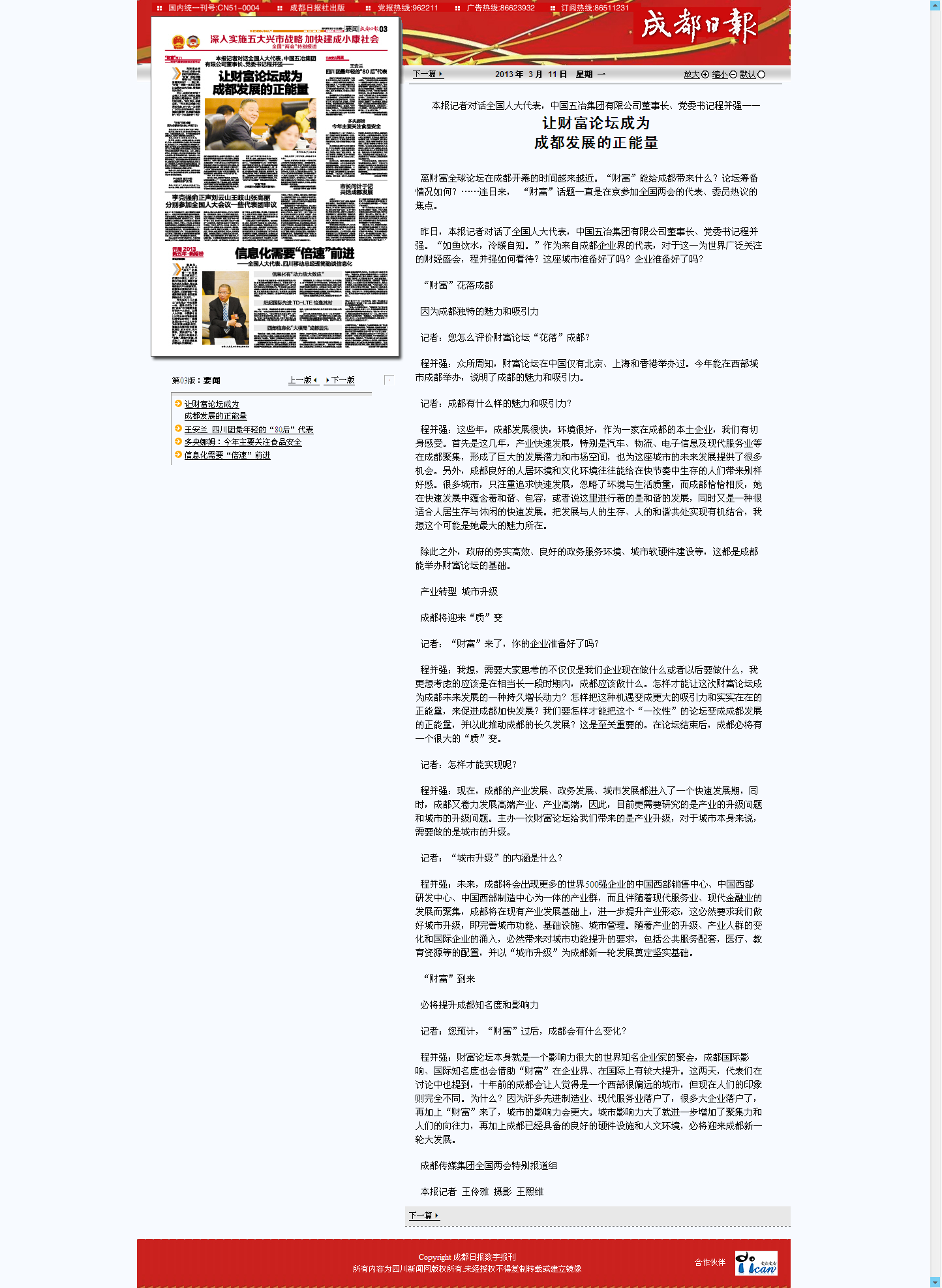 成都日報報道:讓財富論壇成為成都發展的正能量