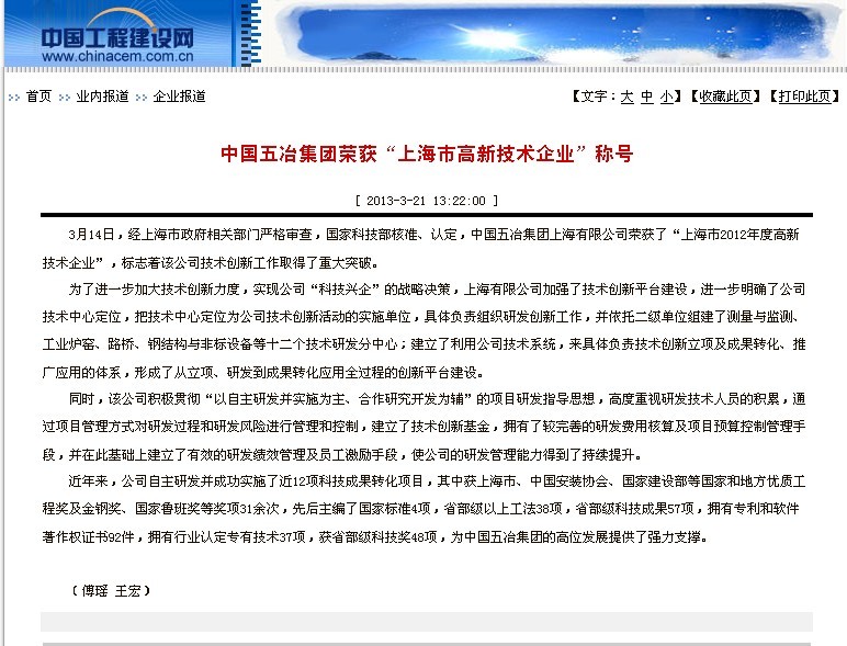 中國工程建設網報道:中國五冶集團榮獲“上海市高新技術企業”稱號