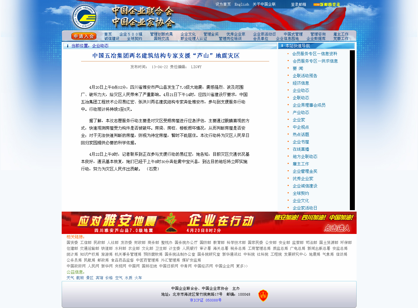 中國企業聯合會網報道:中國五冶集團兩名建筑結構專家支援“蘆山”地震災區