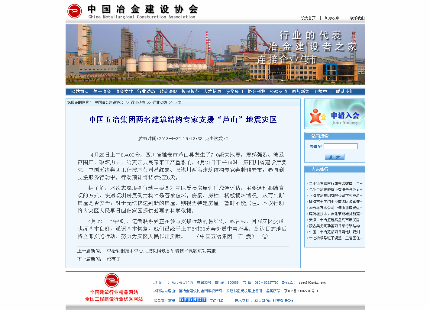 中國冶金建設網報道:中國五冶集團兩名建筑結構專家支援“蘆山”地震災區