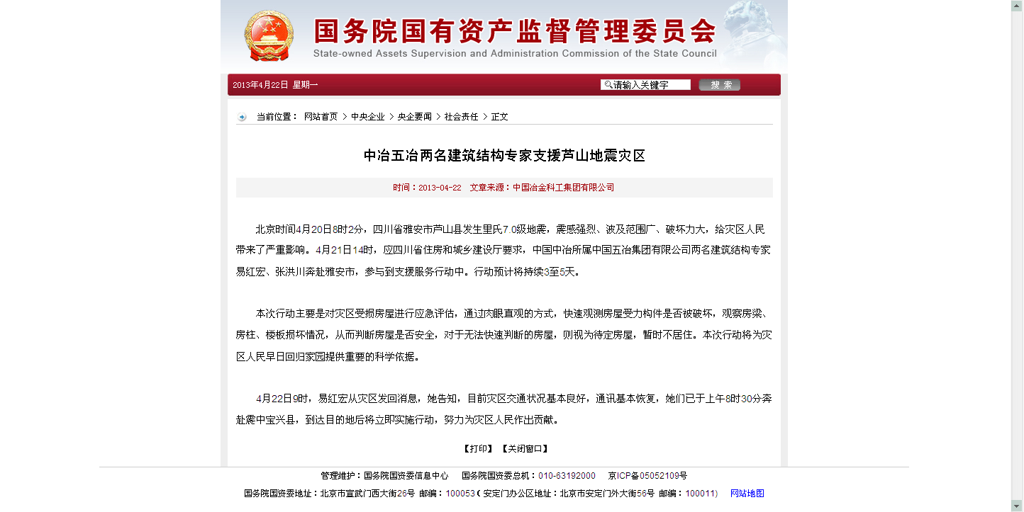 國資委報道:中冶五冶兩名建筑結(jié)構(gòu)專家支援蘆山地震災區(qū)