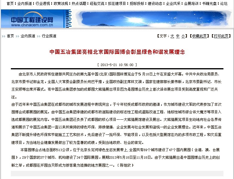 中國(guó)工程建設(shè)網(wǎng)報(bào)道:中國(guó)五冶集團(tuán)亮相北京國(guó)際園博會(huì)彰顯綠色和諧發(fā)展理念