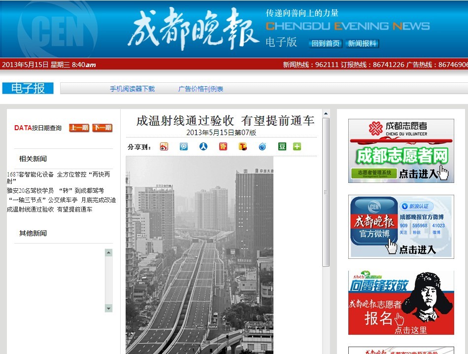經過285天的不間斷施工,成溫射線已于前日舉行了竣工驗收會,全面通過了市建委對地勘、監測等五大部分的驗收。驗收通過意味著無論從質量上,還是進度上,成溫射線都達到了通車條件。
