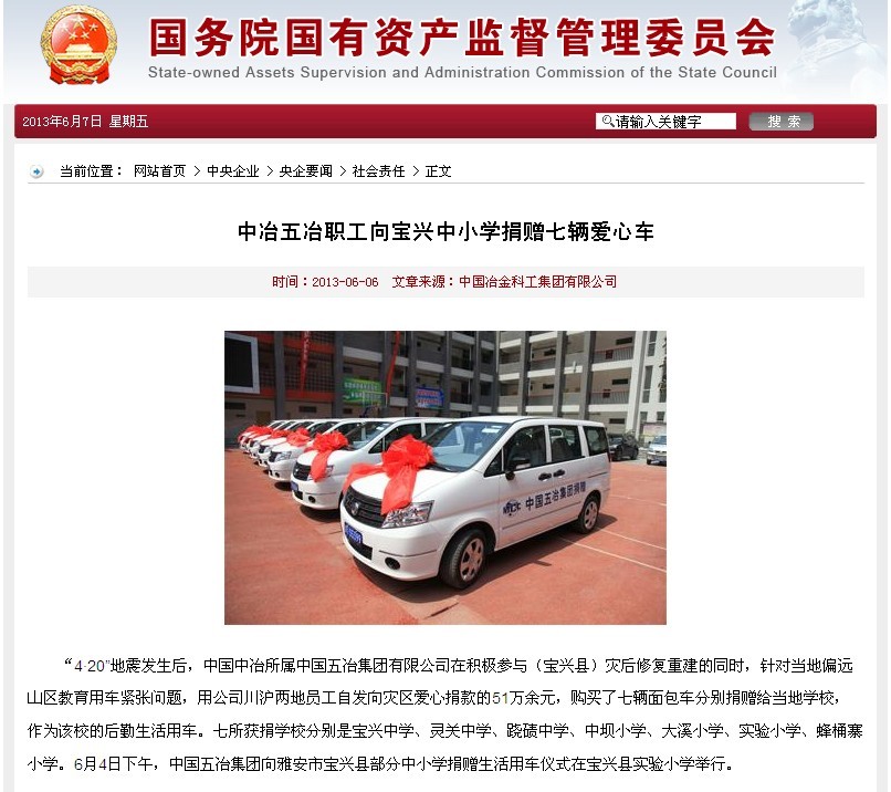 國資委報道:中冶五冶職工向?qū)毰d中小學(xué)捐贈七輛愛心車