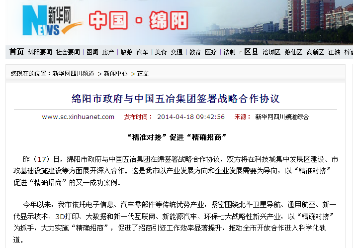 4月18日,新華網四川頻道、四川日報網、綿新網等多家媒體報道中國五冶集團與綿陽市政府簽署戰略合作協議。