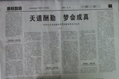 4月9日,《建筑時報》第3209期第七版頭條以《天道酬勤?夢會成真——中國五冶承建越南臺塑河靜鋼鐵項目紀實》為題,從“初戰告捷,業精于勤;遭遇轉折,化險于勤;涅槃重生,?夢圓于勤”三個方面,刊文報道了中國五冶集團海外項目管理中較先進和較成熟的管理模式,對中國五冶為確保項目履約質量而配備的高效實用的應急處理機制進行了詳細梳理。